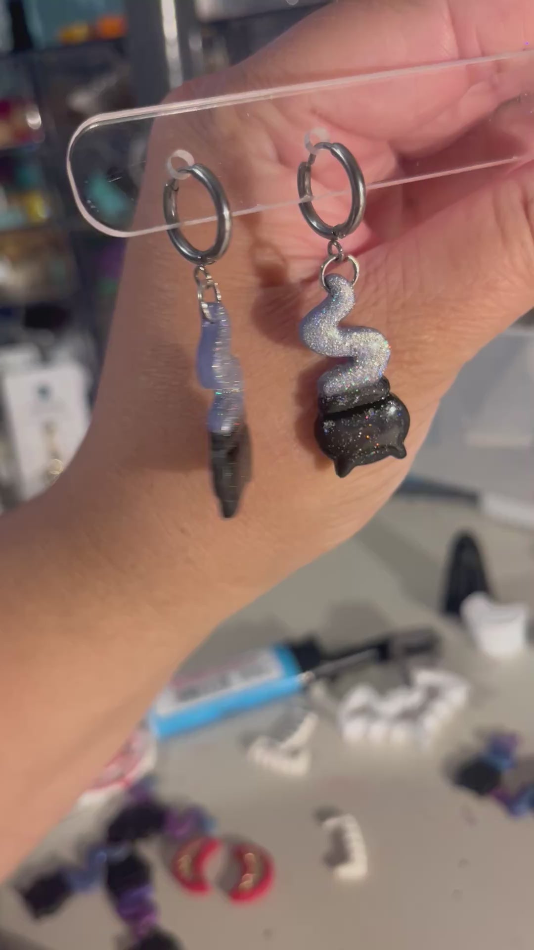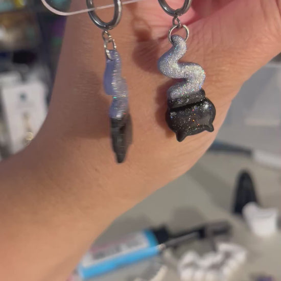 Brew up some sparkly sparkle with these glittery cauldron earrings! Each one features a swirl of holographic “smoke” rising from a shimmering potion pot, dangling from stainless steel hoops. Perfect for adding a touch of witchy magic to any outfit.